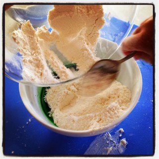 Following this, MT spooned in the flour and salt which we had previously mixed together.